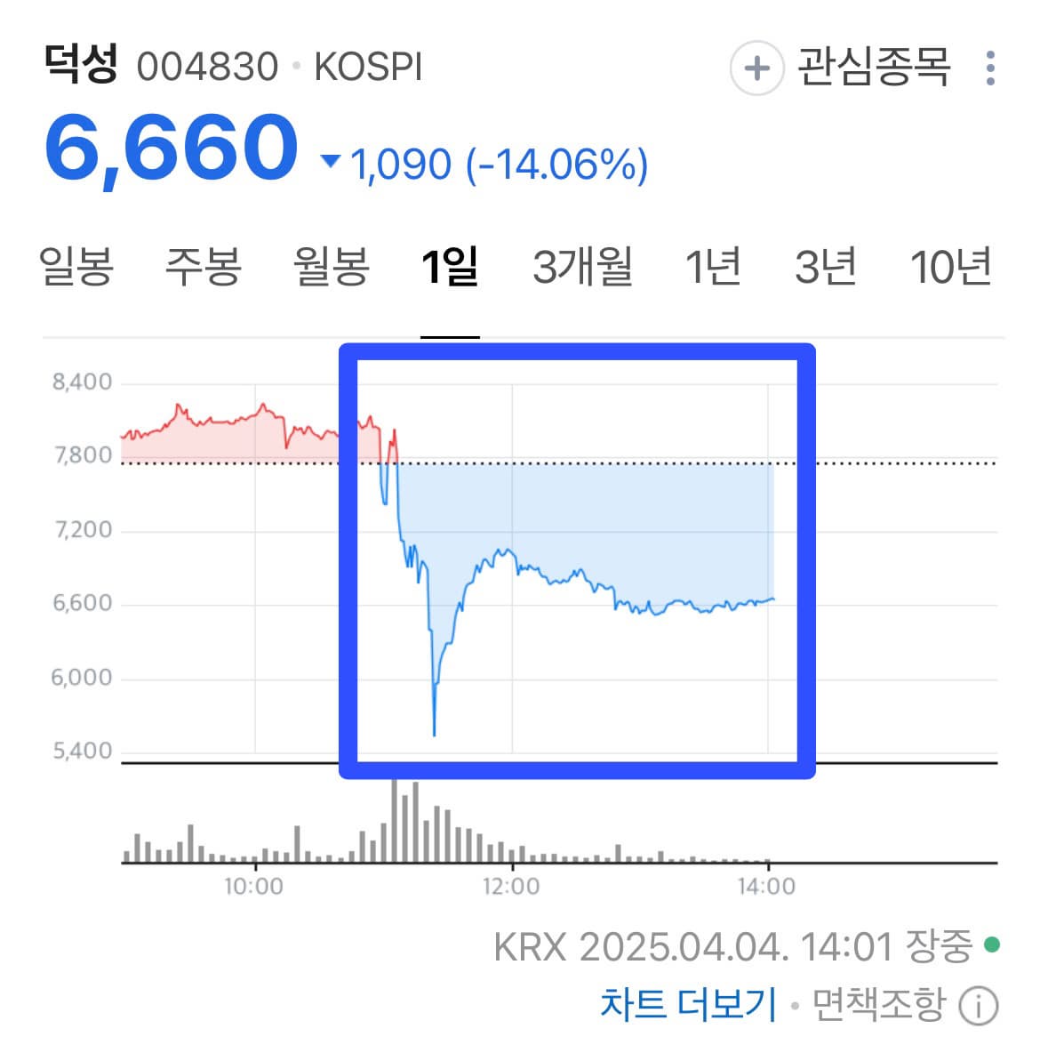 덕성: 장중 한때 -14% 이상 폭락